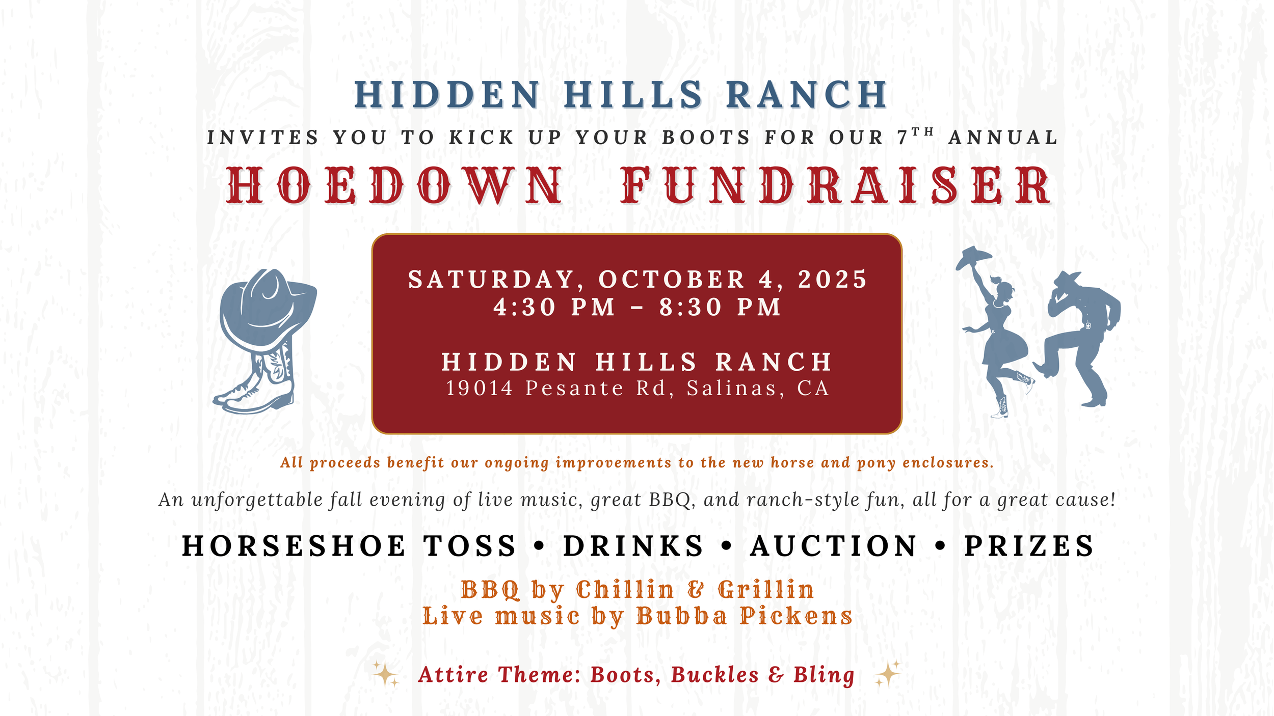 We are excited to invite you to support our 7th Annual Hoedown Fundraiser on Saturday, October 4, 2025, from 4:30–8:30 PM—an evening filled with dinner, live music, community spirit, and a lively silent auction. This is our largest fundraiser of the year, and our goal is to raise $35,000 to fund a major renovation of our pony and miniature horse pastures.